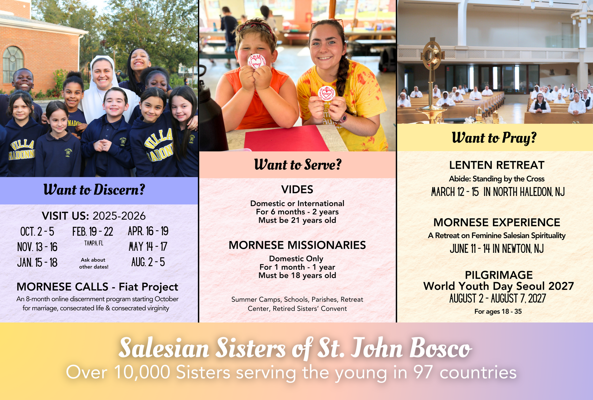 The "Come & See" visit is a special opportunity for young women to get to know us "up close" by staying with one of our communities for a few days. It also gives us the opportunity to know her better. Share prayer, ministry, meals, good conversations, and fun with the Salesian Sisters and see if the Lord speaks to your heart during your visit. The dates below are formally organized Come & See dates, but if none of these work for you, reach out to us and we can make something work.